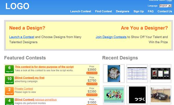 DesignContestScript is a commercial PHP script to create a logo and design contest website where designers can meet clients who need logos and designs created. It's 99designs.com clone with some twists. Features Highlight: Launch a Contest with Multiple Prizes, Make a Guaranteed Contest, Set a Private Contest, Can have different fees for each contest category, Option to charge the contest fee before it's launched, Option to take commission from prize payment and much more.