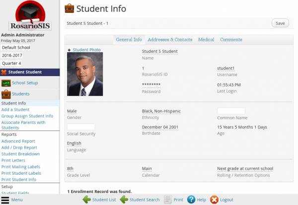 RosarioSIS will give you the tools for your school, students, and teachers. Enter & consult reports generate PDF about grades, schedules, attendance, discipline, student billing, food service.